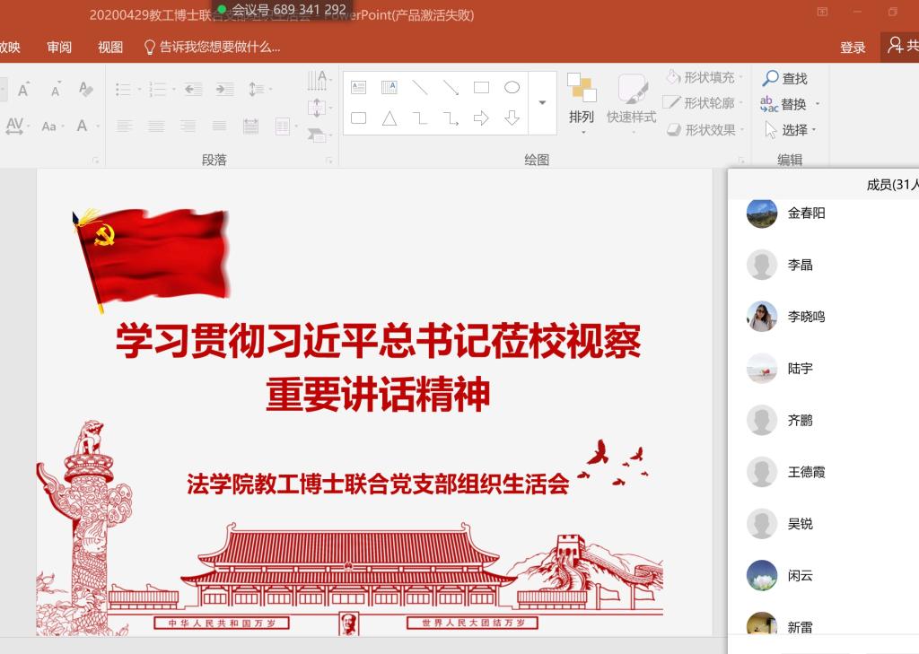 4月29日下午,火博APP官网(中国)有限公司教工博士联合党支部开展线上组织生活会,深入学习贯彻习近平总书记莅校视察重要讲话精神。党支部成员通过网络平台积极参加学习,本次活动由支部书记曹毅博主持。