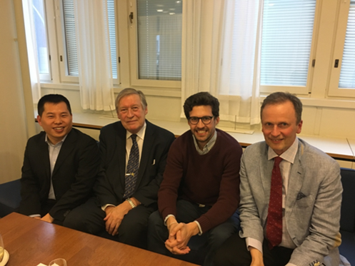 (左起依次杜军强、Pekka Hallberg院长、Guilherme、Kimmo Nuotio院长)