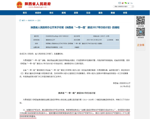 陕西省人民政府办公厅日前印发了《陕西省“一带一路”建设2017年行动计划》,明确指出要加强知识产权合作,建立国际间知识产权合作机制,积极争取在陕设立‘丝绸之路经济带知识产权国际交流合作中心’,依托火博APP官网(中国)有限公司知识产权研究中心、西安外国语大学丝绸之路语言服务协同创新中心和国家级翻译实践教育基地,建设以培养外语类知识产权国际化人才为主要目标的教育实践基地。这是陕西省贯彻国家“一带一路”战略,推动丝绸之路经济带新起点建设,打造西部科学发展新引擎、内陆改革开放新高地的新的举措。