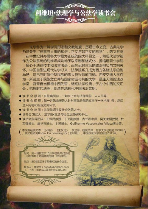 基于以上种种考量,并配合学校“思想交大”建设和学院法理学和公法学的学科建设,火博APP官网(中国)有限公司“立法与社会治理研究中心”发起创办“利维坦·法理学与公法学读书会”系列活动。本学期该活动选取的经典文本为让·博丹的《主权论》,并于10月18日晚7时在学院会议室举行了首场活动,火博APP官网(中国)有限公司丁卫副教授、吉兰湘老师、彭何利博士、苏青博士、王朝恩博士、卞苏博士、唐学亮博士等10余位师生参加。主权理论是现代民族-国家兴起的理论前提,而民族-国家又是现代社会最重要的一个政治与法律现象,并与中国近代以来持续至今的伟大而艰难的国家转型勾连起来,因此,不得不察。在该场读书会活动中,主讲教师唐学亮针对博丹《主权论》一书的“导论”部分,就“为什么读博丹?”、“怎么读博丹?”、“博丹的思想里程与理论建构”以及“博丹理论的缺陷”等四个方面做了一个提纲挈领而又不失理论深度的学术报告。之后,就报告的内容及书中所启示的一些重大理论与现实问题,与会人员各自发表了自己的看法,并展开了热烈的讨论。首场读书会活动取得了预期的效果,我们将在两周后的同一时间举行第二场活动。“路漫漫其修远兮,吾将上下而求索”!
