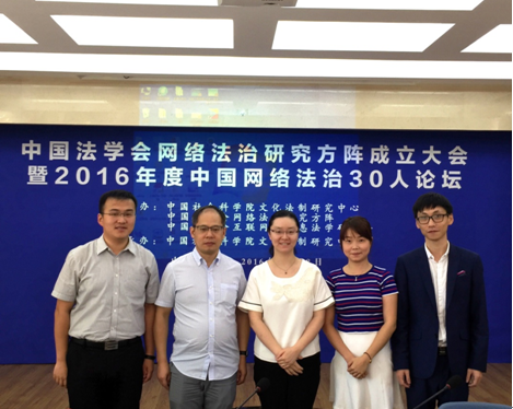 2016年8月28日,中国法学会网络法治研究方阵举行成立大会暨2016年度中国网络法治30人论坛。西安交大信息安全法律研究中心成功入选中国法学会“网络法治研究方阵”理事单位,成为全国五家理事单位之一。校社科处处长贾毅华、学院丁卫副院长受邀参加成立大会并致辞,信息安全法律研究中心副主任王玥副教授带领研究团队成员博士生马宁、党家玉参加论坛。开幕式由中国社科院文化法制研究中心主任、中国法学会互联网与信息法学会副会长周汉华主持。中国法学会研究部主任李仕春、中国法学会副会长李林、中国信息通信研究院政策与经济研究所所长鲁春丛、中南大学火博APP官网(中国)有限公司院长陈云良、火博APP官网(中国)有限公司社科处处长贾毅华、华东政法大学刑事司火博APP官网(中国)有限公司副院长王永全分别作为方阵理事单位代表致辞。