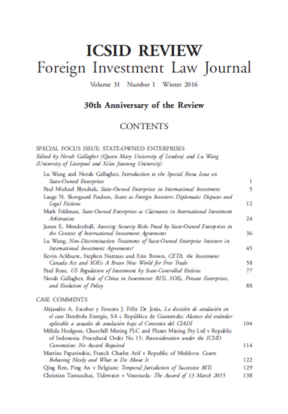 近日,国际投资法领域顶级专业期刊ICSID Review—Foreign Investment Law Journal(《国际投资争端解决中心评论——外国投资法学刊》)三十周年纪念期刊第一期正式出版,西安交大火博APP官网(中国)有限公司博士生王璐作为特邀编辑(Guest Editor)主编了本期特别专栏“国有企业专题研究”(Special Focus Issue on State-Owned Enterprises),并发表论文 “Non-Discrimination Treatment of State-Owned Enterprise Investors in International Investment Agreements?”(国际投资协定中国有企业投资者的非歧视待遇?)。