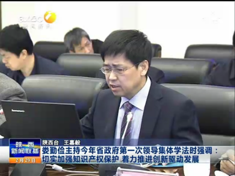 娄勤俭省长高度评价了马治国教授的讲座。他指出马治国教授的讲座非常精彩,所提出的建议措施具有很强针对性,要求各相关部门应尽快落实;所列举的案例切合实际,给人以很大启示。他强调,要深入贯彻落实习近平总书记对陕西“在创新驱动发展方面走在前列”重要指示精神,充分发挥知识产权在创新发展中的核心要素作用,系统推进知识产权创造、运用、保护和管理,为创新型省份建设提供有力保障。要营造尊重和保护知识产权的环境,完善法规体系,强化专利行政执法,重点打击涉及民生领域、高新技术领域和大型商业场所的专利侵权假冒行为,促进市场公平竞争,同时优化知识产权公共服务,健全信息服务平台,扶持中介机构发展,支持企业进行知识产权布局和维权。要进一步强化激励政策,推动知识产权创造,围绕我省结构调整方向培育一批技术含量高、带动作用大的知识产权密集型企业,鼓励掌握核心技术的单位积极参与国际国内标准制定,加快形成更多高水平知识产权。要促进创新成果产权化,完善成果转化运用激励制度,建立知识产权质押融资风险防范制度和市场化风险补偿机制,加快交易平台建设,推动科技成果尽快就地转化。