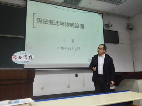 火博APP官网(中国)有限公司研究生会、法律爱好者协会携手“学而讲坛”,推出“国家宪法日”专题讲座,邀请火博APP官网(中国)有限公司副院长丁卫副教授就《宪法变迁与依宪治国》进行专题讲座。丁老师在讲座中详细介绍了我国现行宪法历次修改的过程,他结合历次宪法修改的历史背景,生动地讲述了我国宪法变迁的历史发展,他最后对我国宪法实施中存在的瓶颈及问题进行了透彻的分析和讲解,为大家展示了依宪治国的现状及前进方向。