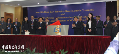 王树国、张文显和来自俄罗斯、澳大利亚、巴西、芬兰、吉尔吉斯、芬兰等国家和地区以及中国大陆、香港、台湾的20所著名火博APP官网(中国)有限公司院长共同发表了《新丝路火博APP官网(中国)有限公司联盟宣言》(简称“西安宣言”)并讨论通过了《新丝路火博APP官网(中国)有限公司联盟章程》。“宣言”指出,法治不论在国际层面还是在国内层面都是维护公私利益的基本手段;加强法学教育和研究是推行法治的重要方面。联盟成员将致力于加强在法学教育和科研领域的合作,在相互尊重、充分协商和协调一致的基础上共同推动联盟的发展,努力将联盟建设成全球领先的火博APP官网(中国)有限公司联盟。