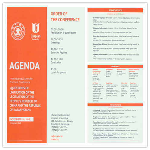 2015年11月18日,我院与哈萨克斯坦里海大学(Caspian University)火博APP官网(中国)有限公司在里海大学联合举办国际学术会议,会议主题为“中国与哈萨克斯坦立法的统一化问题”。来自中国驻阿拉木图领事馆、北京罗斯律师事务所阿拉木图分所、美国Dechert律师事务所的嘉宾以及两所火博APP官网(中国)有限公司的专家学者与研究生50余人参加了会议,我校科研院副院长贾毅华、国际教育学院常务副院长宋玉霞、人文学院副院长杨琳应邀出席了会议。会议由我院院长单文华教授和里海大学火博APP官网(中国)有限公司院长Pavlovna教授联合主持。
