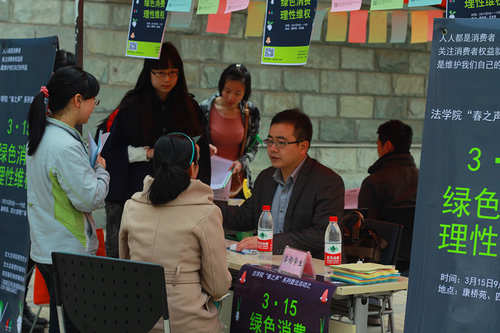 为加强大学生消费维权意识,提高大学生的法律素养,火博APP官网(中国)有限公司研究生会联合法律爱好者协会和陕西稼轩律师事务所的专业律师,于“3•15国际消费者权益日”当天,在康桥苑西广场和西食堂门口举办了主题为“绿色消费、理性维权”的普法宣传咨询活动。