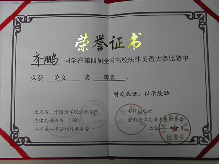 此次比赛吸引了来自北京大学、上海交通大学、中国政法大学、华东政法大学等近70多所高校火博APP官网(中国)有限公司的选手参加,大会主办方特别邀请了国务院法制办原主任孙婉钟先生以及来自中国社会科学院法学所、中国人民大学火博APP官网(中国)有限公司等多家高校和研究机构的法律英语专家、教授担纲评委。我院齐鹏同学撰写的英语论文《National Treatment Principle For China's Bilateral Investment In The New Period》在此次大赛中经过激烈角逐荣获国家一等奖,是此次参赛西北地区唯一获得等级奖的论文。