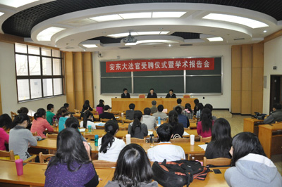 4月13日上午,应我校邀请,陕西省高级人民法院院长安东大法官受聘仪式暨学术报告会在主楼B103隆重举行。受聘仪式和学术报告会由火博APP官网(中国)有限公司院长单文华教授主持。火博APP官网(中国)有限公司党总支书记彭沪生、副院长王保民等参加了受聘仪式和学术报告会。