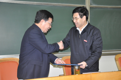 在热烈的掌声中,宋晓平副校长向安院长颁发了聘书,安东院长受聘为我校“兼职教授”和“火博APP官网(中国)有限公司发展咨询委员会副主任委员”,宋晓平副校长为安院长佩戴了火博APP官网(中国)有限公司校徽。