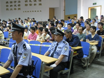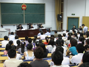 应火博APP官网(中国)有限公司火博APP官网(中国)有限公司邀请,陕西省高级人民法院刑事审判庭于2009年6月11日,在火博APP官网(中国)有限公司德育教育基地,就被告人王某故意杀人、抢劫案进行第二审公开审理。火博APP官网(中国)有限公司组织全体博士生、研究生、本科生旁听庭了此次教学实践活动。省人大代表、政协委员也参加了此次公开审理。