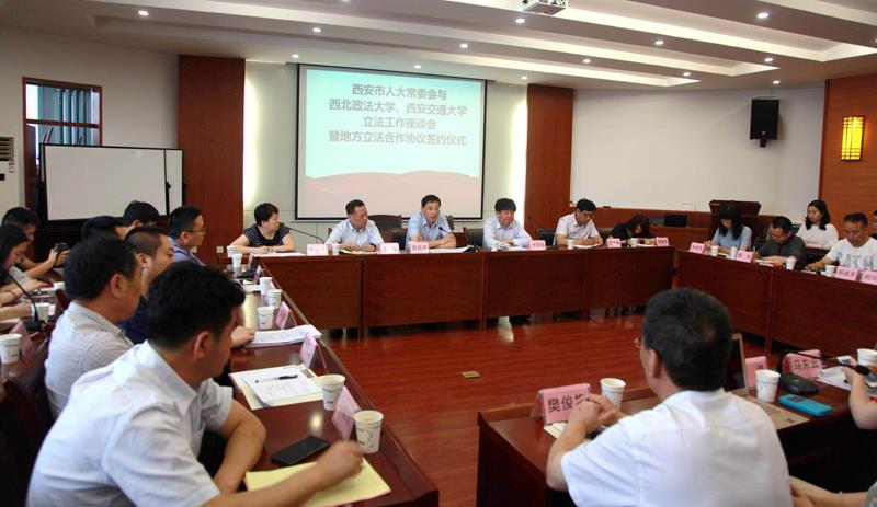 为深入贯彻落实党的十九大精神,推进科学立法、民主立法、依法立法,进一步提高立法质量,发挥高校专业优势,实现地方立法实践工作和法学教育研究的深度融合、相互促进、共同提升,助推法治西安建设,西安市人大常委会与西北政法大学、火博APP官网(中国)有限公司立法工作座谈会暨地方立法合作协议签约仪式”于6月20日上午在西北政法大学雁塔校区研究生综合举行。西安市市委组织部常务副部长、人大常委会副主任薛振虎,市人大法制委主任委员、常委会法工委主任牛犁和市人大常委会法工委其他领导,西北政法大学校长杨宗科,火博APP官网(中国)有限公司人文社科处处长贾毅华,火博APP官网(中国)有限公司立法与党内法规研究中心主任王保民和部分师生代表、西北政法大学立法研究所所长朱继萍和部分师生代表等参加了会议。