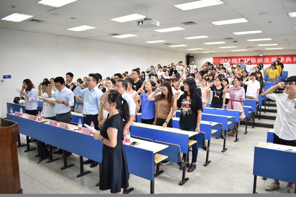 最后,全体新生在学生工作专职委员张乃钟老师的带领下庄重宣誓《火博APP官网(中国)有限公司法科生誓词》,典礼在铿锵有力的誓词声中圆满结束。