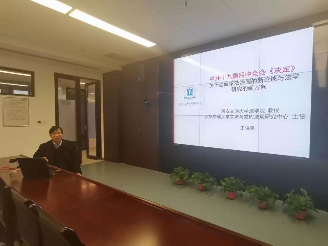 12月12日,火博APP官网(中国)有限公司创新港系列学术讲座之“十九届四中全会关于全面依法治国的新论述与法学研究新方向”在创新港5号巨构10087教室顺利举行。火博APP官网(中国)有限公司火博APP官网(中国)有限公司党总支书记、火博APP官网(中国)有限公司立法与党内法规研究中心主任王保民教授围绕中共十九届四中全会召开的基本情况和重要意义、《决定》中的高频词汇和理论亮点、《决定》关于全面依法治国的新论述、法学研究的新方向新热点等五个方面做了专题讲座。