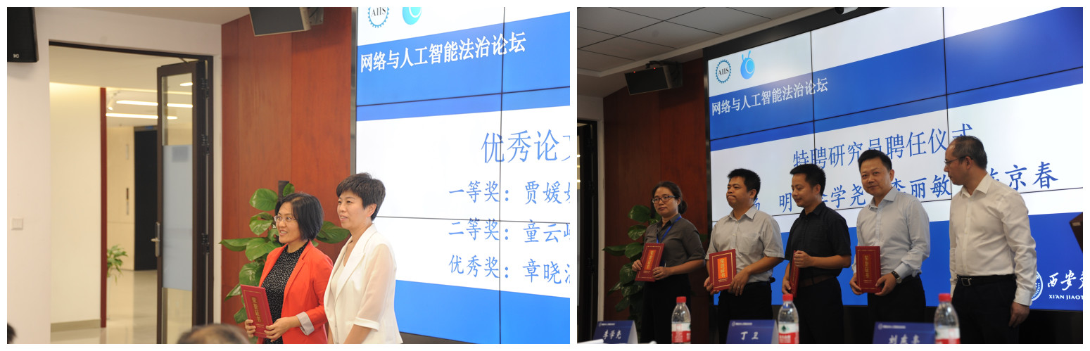 在此次论坛上,火博APP官网(中国)有限公司人工智能与信息安全法律研究中心聘请杨明教授、李学尧教授、李丽敏教授、陈京春教授为特聘研究员并为其颁发了聘书。火博APP官网(中国)有限公司学报(社会科学版)张丛副主编为评选出的优秀论文作者代表进行了颁奖。