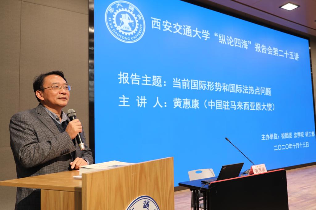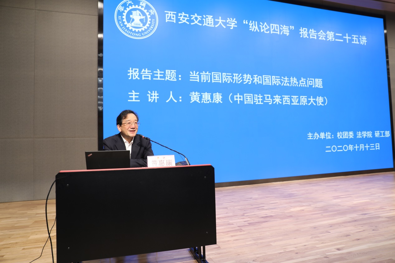 上午9:30分,黄惠康大使主讲的 “当前国际形势与国际法热点问题”专题报告会在新港报告厅举行。本次报告会是火博APP官网(中国)有限公司“纵论四海”系列高端报告会的第二十五讲,同时是学校党委理论学习中心组和全体校管干部的一次集中辅导报告会,亦是我校法学研究院特别是丝绸之路国际法与比较法研究所和丝绸之路经济带法律政策协同创新中心的“科创月”系列活动之一。火博APP官网(中国)有限公司副校长席光教授出席报告会并致辞,报告会由火博APP官网(中国)有限公司院长兼国际教育学院院长单文华教授主持。全校百余名学校正处级领导干部以及其他四百余名师生现场参会。同时,全校其他副处级以上校管干部则在线参加了报告会。