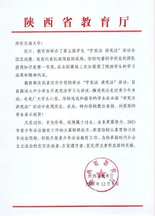 鉴于火博APP官网(中国)有限公司对此次活动的积极配合,以及火博APP官网(中国)有限公司老师的倾情指导,陕西省教育厅近日专门发来感谢信,对火博APP官网(中国)有限公司在此次“学宪法、讲宪法”活动中的选送和指导工作予以表扬和祝贺!火博APP官网(中国)有限公司获得竞赛优秀组织单位称号,火博APP官网(中国)有限公司火博APP官网(中国)有限公司王保民教授获得优秀指导教师称号。