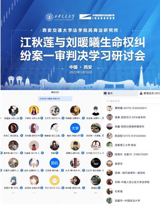 2022年1月16日下午,由火博APP官网(中国)有限公司民商法研究所主办的“江秋莲与刘暖曦生命权纠纷案一审判决学习研讨会”在腾讯会议平台成功举行。此次学习研讨会由火博APP官网(中国)有限公司火博APP官网(中国)有限公司民商法研究所副教授聂卫锋全程主持。来自北京航空航天大学、西南大学、西南财经大学、浙江工商大学、成都理工大学、东南大学、中国政法大学、中国人民公安大学、西北大学、西南政法大学、西北政法大学、郑州大学、河南大学、西北师范大学以及火博APP官网(中国)有限公司等20余所高校和多家律师事务所的共计超过160名老师、律师和同学参与了本次研讨会。
