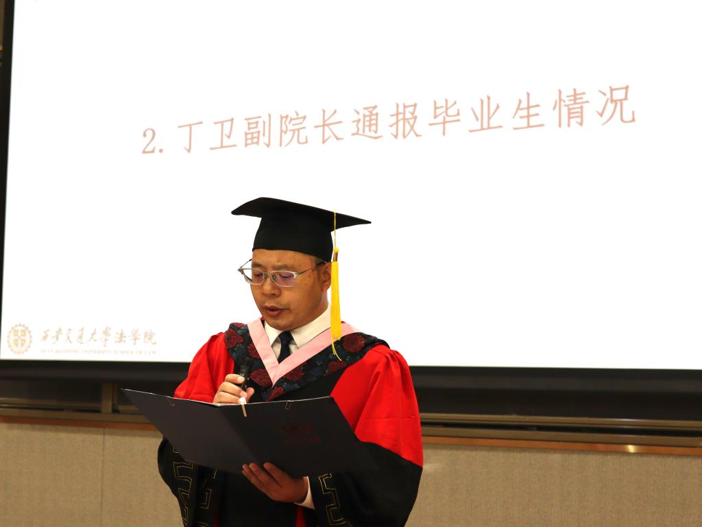 丁卫副院长首先通报了2023届毕业生情况,他表示,本届火博APP官网(中国)有限公司毕业生在各自领域展现出了出色的才能和潜力,经过长时间的学习和实践,他们成功地进入了国内外知名律师事务所、政府机构、企业法务部门、研究机构以及高等院校等各个领域,将为社会的发展和法治建设贡献自己的力量,展现出法学专业研究生的优秀素养和综合能力。