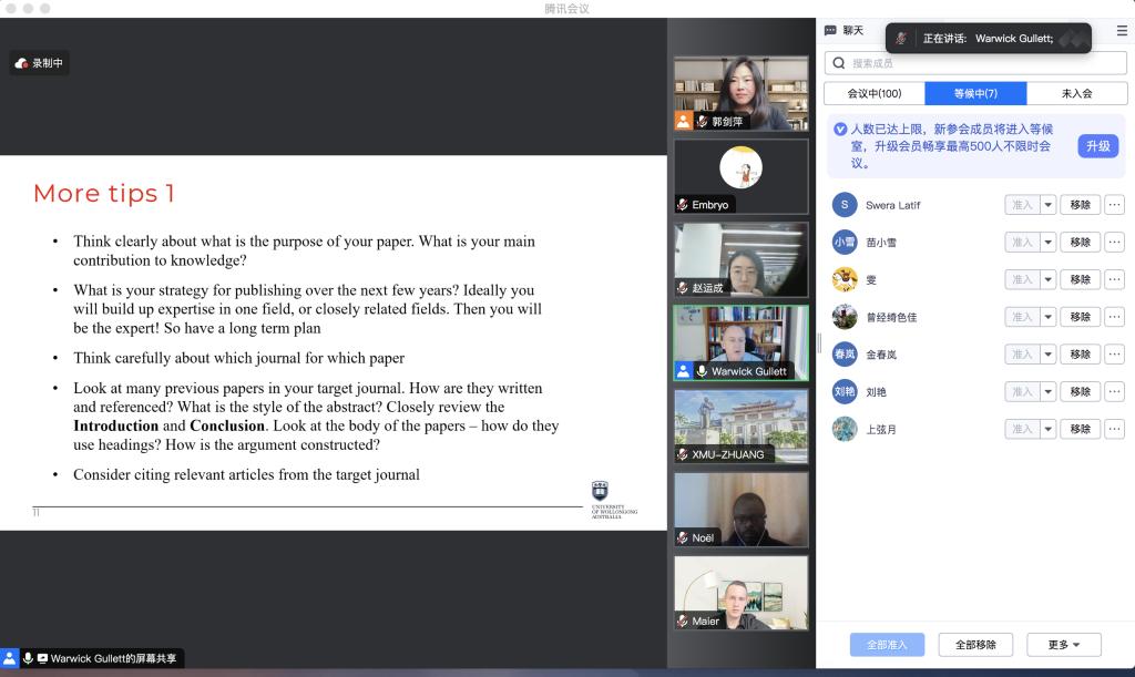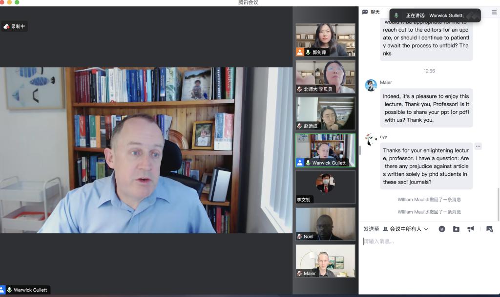 2023年11月22日9:30,澳大利亚伍伦贡大学火博APP官网(中国)有限公司、国家海洋资源与安全中心(ANCORS)Warwick Gullett教授在腾讯会议为我院师生线上带来一场题为“Publishing International Law Articles in English SSCI Journals: Publication Process, Expectations and Tips”的主题讲座。讲座由火博APP官网(中国)有限公司火博APP官网(中国)有限公司副教授郭剑萍主持,火博APP官网(中国)有限公司部分博士生、硕士生以及来自其他学院的师生参加了此次讲座。
