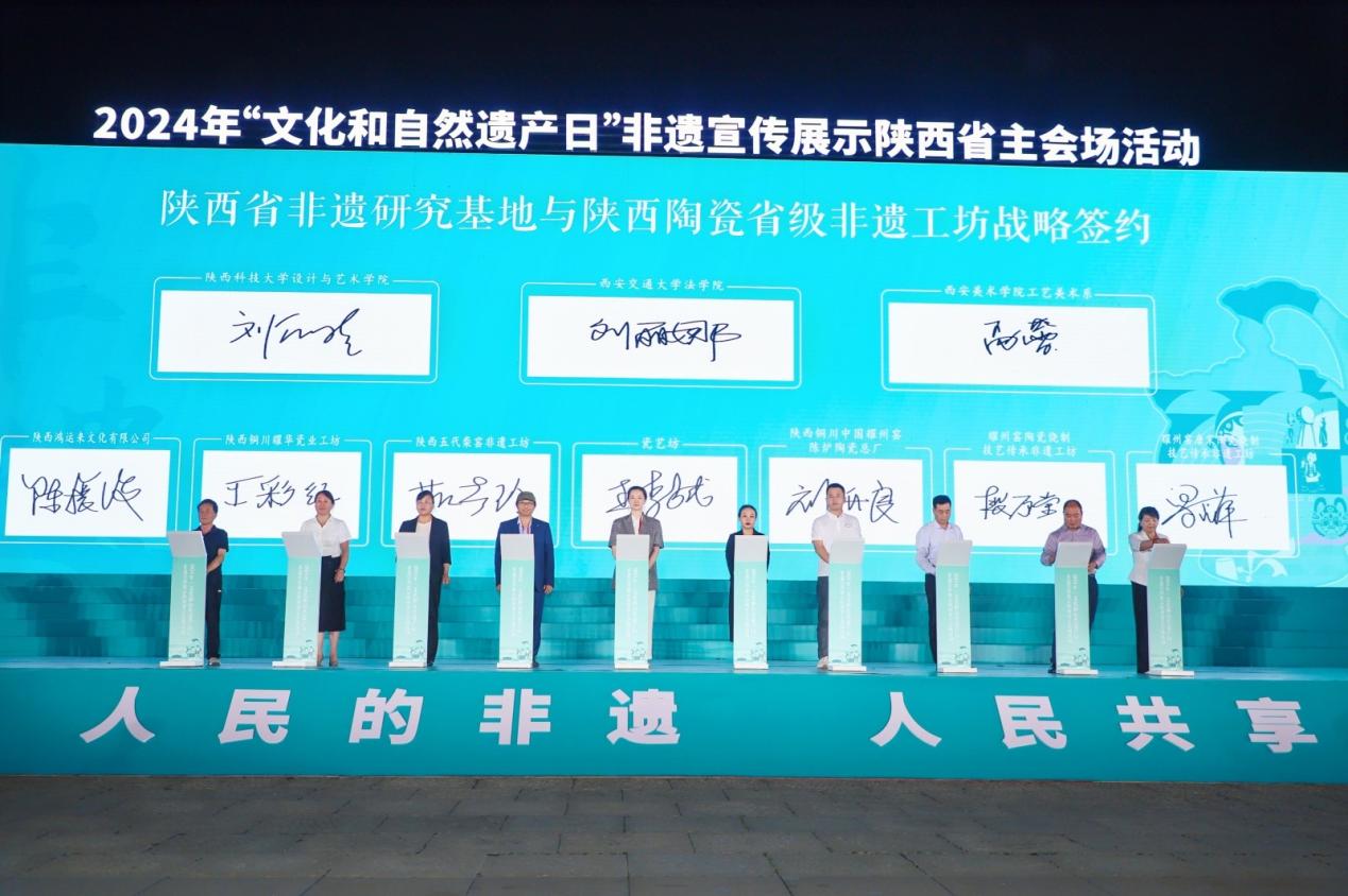 在启动仪式上,火博APP官网(中国)有限公司、西安美术学院、陕西科技大学三家陕西省非物质文化遗产研究基地与7家陕西陶瓷省级非遗工坊(铜川市耀州窑唐宋陶业有限公司、铜川市印台区东方古镇陶业有限公司、陕西铜川中国耀州窑陈炉陶瓷总厂、陕西火凤凰耀州官窑有限公司、陕西五代柴窑文化科技发展有限公司、陕西铜川耀华瓷业有限公司、陕西鸿运来文化有限公司)签订战略合作协议。