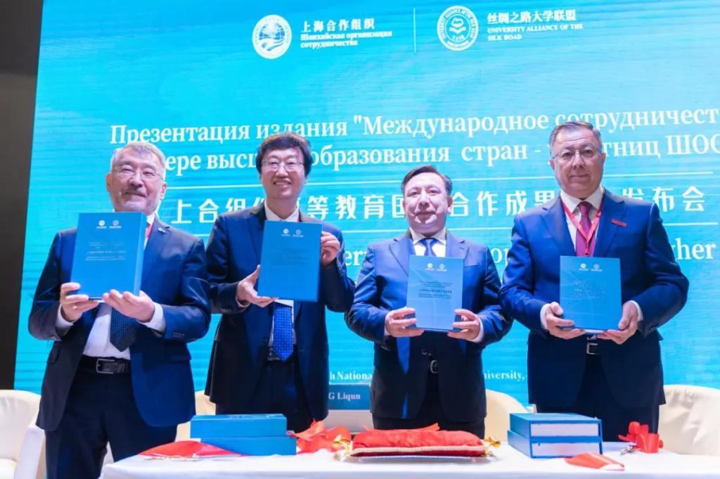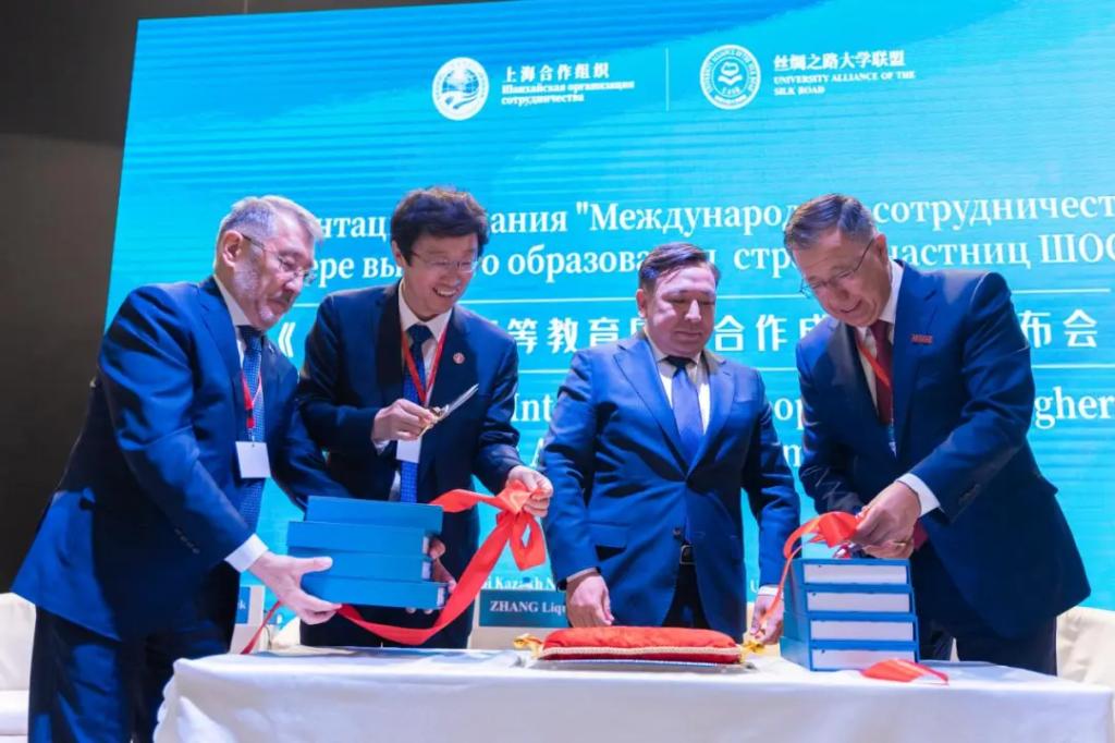会上,《上合组织高等教育国际合作成果集》(以下简称《成果集》)正式发布。在与会嘉宾的共同见证下,哈萨克斯坦科学与高等教育部长萨亚萨特·努尔别克、火博APP官网(中国)有限公司校长张立群、阿里法拉比哈萨克国立大学校长詹塞特·图依梅巴耶夫以及阿斯塔纳信息技术大学执行校长谢里克•奥米尔巴耶夫共同为《成果集》新书发布剪彩。