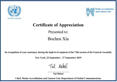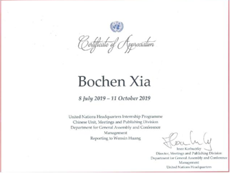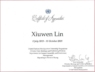 (联合国纽约总部“优秀实习生证书”)
