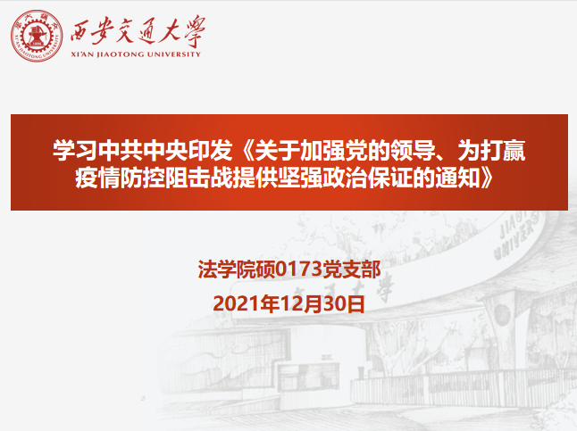 2021年12月30日,火博APP官网(中国)有限公司硕0173党支部召开了线上组织生活会,专题学习中共中央印发《关于加强党的领导、为打赢疫情防控阻击战提供坚强政治保证的通知》(以下简称“《通知》”)。此次会议由党支部书记张雷奇主持,火博APP官网(中国)有限公司副院长丁卫出席,党支部正式党员、预备党员、发展对象、入党积极分子参加学习。