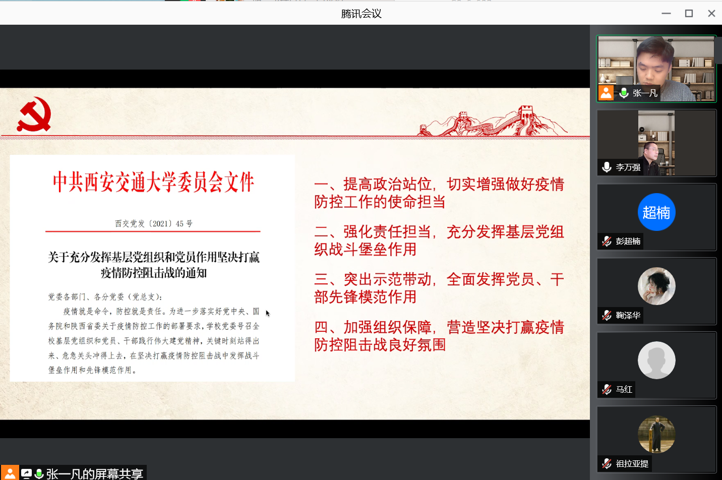 12月31日上午,火博APP官网(中国)有限公司硕1173党支部召开线上组织生活会,深入学习落实上级党委关于疫情防控的相关文件精神。党支部成员及入党积极分子代表共计15人参与本次会议,火博APP官网(中国)有限公司副院长李万强教授出席。会议由党支部书记张一凡主持。