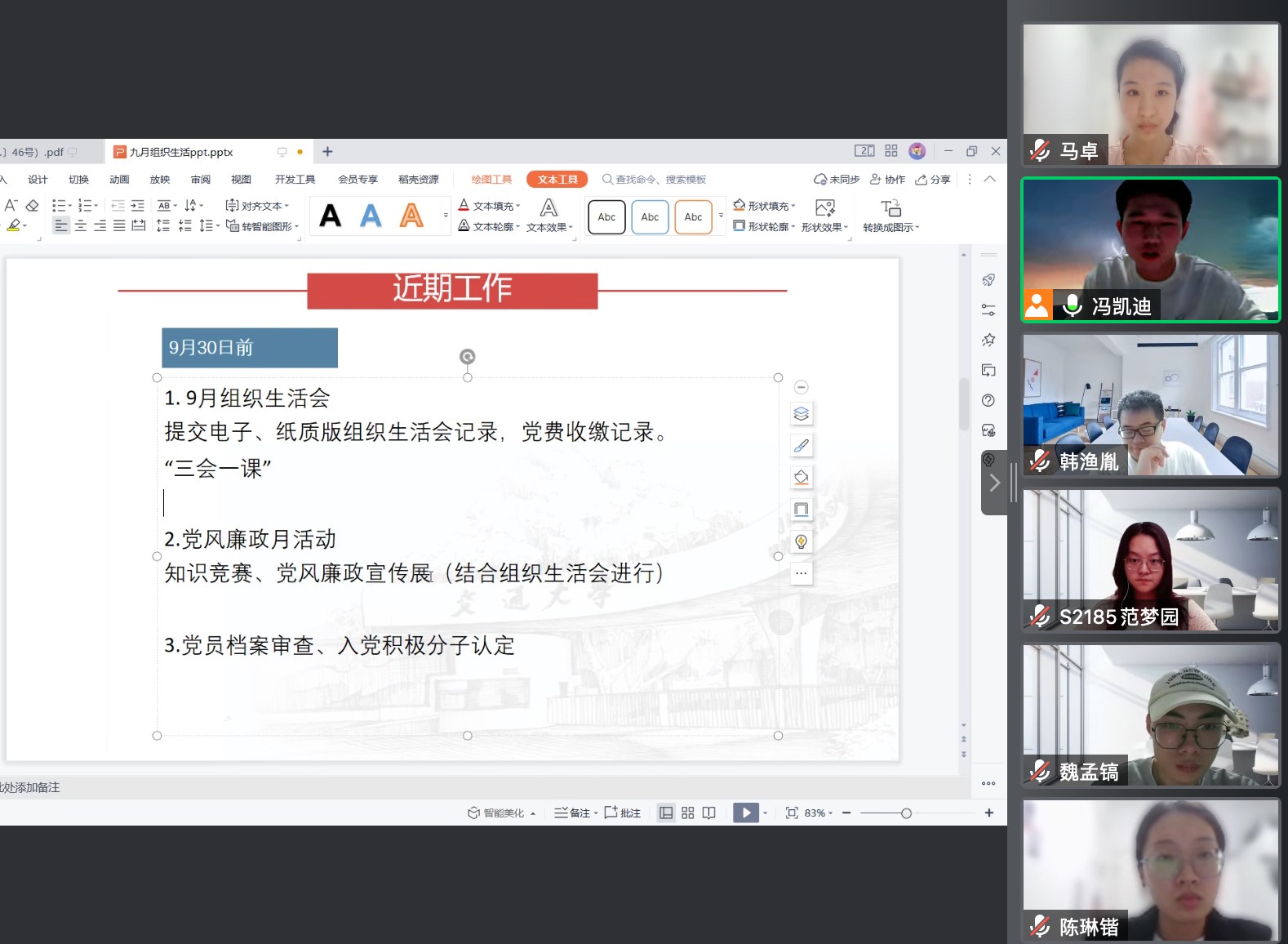 2022年9月27日晚,火博APP官网(中国)有限公司硕2185党支部举行了九月组织生活会,也是本支部的第一次会议。根据疫情防控相关要求,本次组织生活会采用线上的方式进行。本次会议由党支部书记冯凯迪主持,党员及入党积极分子共15人参加会议。
