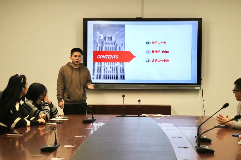 首先,由党支部书记冯凯迪向支部成员宣讲党的二十大精神,他带领大家学习了习近平总书记代表中国共产党第十九届中央委员会于2022年10月16日在中国共产党第二十次全国代表大会上向大会所作的报告《高举中国特色社会主义伟大旗帜 为全面建设社会主义现代化国家而团结奋斗》,该报告深刻总结了过去五年党和国家事业的重要成就和新时代十年的伟大变革,为全面建设社会主义现代化国家、全面推进中华民族伟大复兴擘画了宏伟蓝图,让人感受到前所未有的振奋和力量。今天的中国身处世界百年未有之大变局,中华民族伟大复兴进入关键时期,站在新的历史起点上,当代青年生逢其时、重任在肩。冯凯迪指出,大家作为新时代的青年党员,要坚定不移听党话、跟党走,以“请党放心,强国有我”的历史主动和历史担当牢牢接过民族复兴的接力棒,勇当开路先锋、争当事业闯将,弘扬西迁精神,在新时代新征程中奋力书写青年的时代答卷,为实现中华民族伟大复兴的中国梦再立新功、再谱新篇。