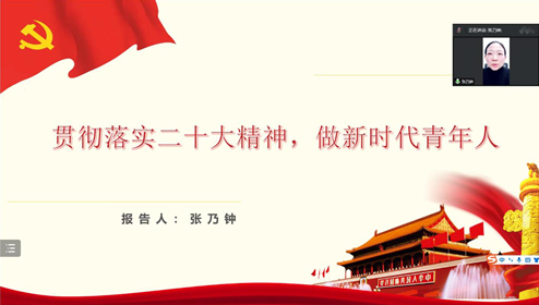 首先,由张乃钟老师作以“贯彻落实二十大精神,做新时代青年人”为主题的宣讲报告,从四个方面分享了她学习二十大精神的学习心得。第一,深刻学习领会党的二十大主题。党的二十大主题是大会的灵魂,是党和国家事业发展的总纲,八十六个字,字字千钧,内涵丰富,思想深刻,意义深远。党的二十大确立这一主题,其目的是鼓舞全党和全国各族人民,勇于变革,勇于创新,万众一心,团结奋斗,奋力开创社会主义现代化建设的新局面。第二,深刻学习领会新时代十年伟大变革中取得的辉煌成就。二十大报告回顾总结了过去五年的工作和新时代十年的伟大变革,展望全面建成社会主义现代化国家新征程,阐述了开辟马克思主义中国化时代新境界,中国式现代化的中国特色和本质要求等重大问题。第三,深刻学习领会党的二十大精神蕴含的三重重大意义。党的二十大精神具有重大的理论意义、时代意义、实践意义。第四,深刻领会学习党的二十大精神是开创未来的行动指南。习近平总书记在党的二十大报告中强调全党同志务必不忘初心、牢记使命,务必谦虚谨慎、艰苦奋斗,务必敢于斗争、善于斗争,坚定历史自信,增强历史主动,谱写新时代中国特色社会主义更加绚丽的华章。三个务必展示了中国共产党人自警自立的政治智慧和求真务实的政治品格。报告的最后,张老师对大家提出了三点希望。第一,主动实现个人价值,树立正确的世界观、人生观、价值观。第二,青年强则国强,要肩负起时代赋予我们的责任。第三,作为青年,要有“功成必定有我”的责任担当,青年有多好,中国就有多好。